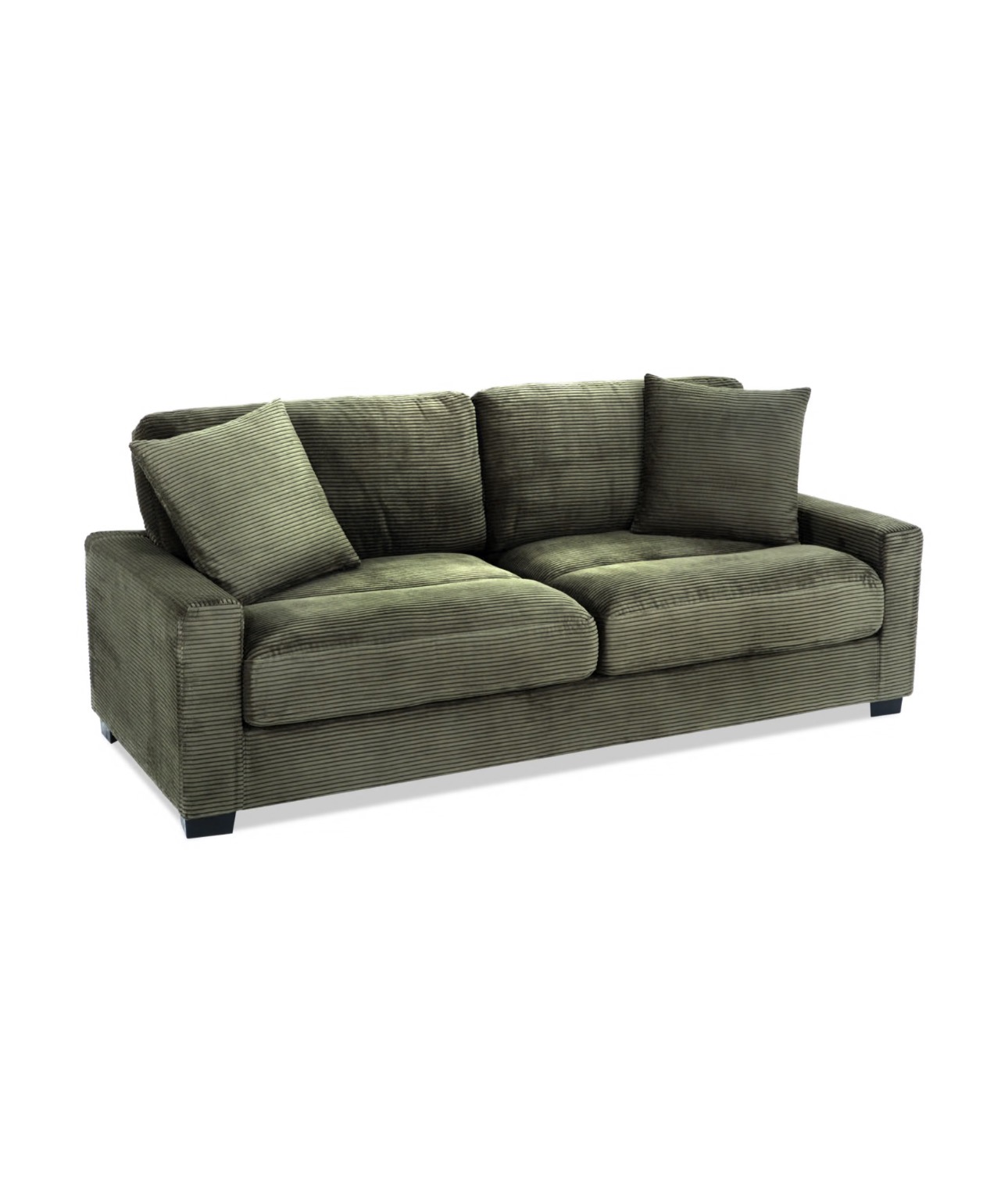 Comfortable two-cushion sofa upholstered in dark olive green corduroy fabric with wide wale texture. Features three loose back pillows, clean track arms, and dark block feet. Appears to be in good condition with no visible stains or significant wear.